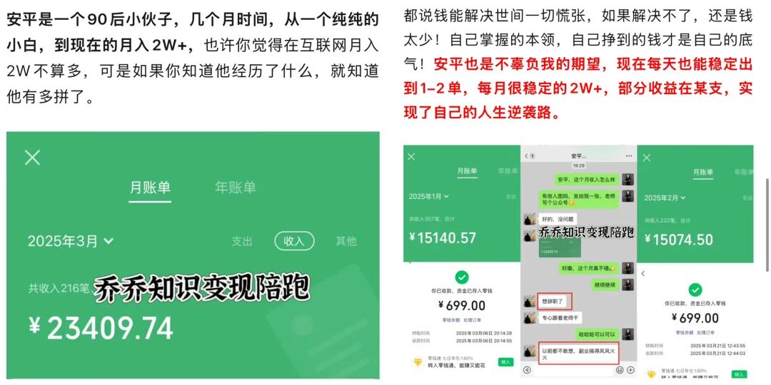 前面文章有讲过我的90后学员安平曾经工资3000,做知识变现月入23409,他真的是纯纯互联网小白,但是只要你做了,就会发现,只要你想做、敢做、坚持做,就没有做不成的,记住:方法对了,路就对了!