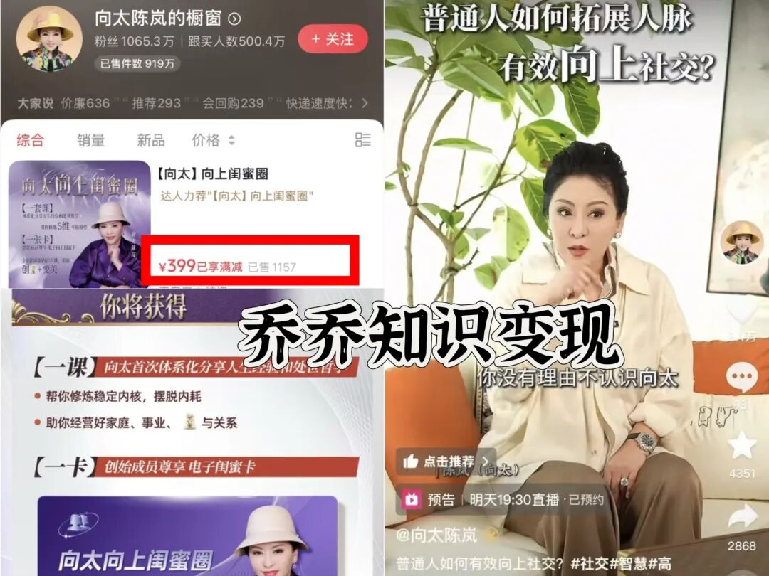 2、所谓知识变现,就是卖知识、卖方法。不知道大家最近有没有关注到,向太知识付费课程《向太阳上闺蜜圈》因个人影响力、精准定位、合理定价、多平台宣传及知识付费市场趋势等因素,销售额近200万。